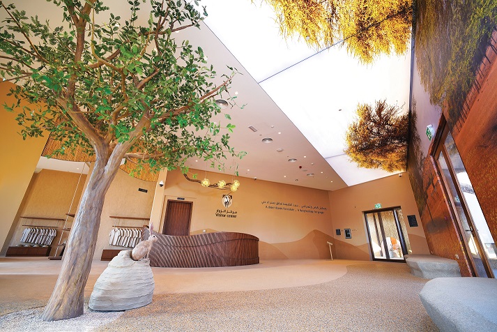 • قاعة الاستقبال Reception Hall: تعد قاعة الاستقبال بمثابة مساحة مفتوحة للترحيب بزوار المركز، حيث يسلط الجدار الضخم والسقف الممتد الضوء على المها العربي في بيئتها الطبيعية. ويتيح الكشك التفاعلي للزوار استكشاف خريطة المحمية، وأماكن مشاهدة الحياة البرية مثل الثعلب العربي.