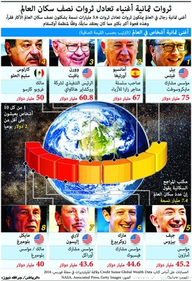 من جهة اخرى ظهر تقرير نشرته منظمة أوكسفام الدولية المعنية بمحاربة الفقر في العالم إن 8 أشخاص فقط يمتلكون ثروات تعادل ما يملكه حوالي 6ر3 مليارات نسمة يمثلون النصف الأفقر من سكان العالم.