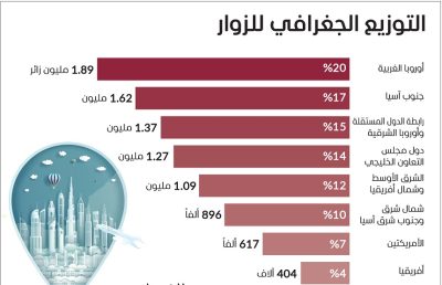 وخلال الفترة بين شهري يناير ويونيو 2024، شكلت نسبة الزوار من دول مجلس التعاون الخليجي ومنطقة الشرق الأوسط وشمال أفريقيا 26 % من إجمالي عدد الزوار، حيث بلغ عدد الزوار 1.27 مليون زائر بنسبة 14 % و1.09 مليون زائر بنسبة 12 % على التوالي. وبلغ عدد الزوار من منطقة أوروبا الغربية 1.89 مليون زائر 20% من إجمالي عدد الزوار، فيما وصل عدد الزوار من منطقة جنوب آسيا إلى 1.62 مليون زائر بنسبة 17 % و1.37 مليون زائر بنسبة 15 % من رابطة الدول المستقلة وأوروبا الشرقية.