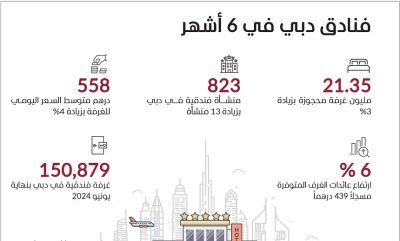 وسجل معدل السعر اليومي للغرفة ارتفاعاً ليبلغ 558 درهماً خلال النصف الأول من العام الحالي، ما يمثل زيادة 4 % بالمقارنة مع نفس الفترة من العام 2023. بينما ارتفع معدل العائدات من الغرف المتوفرة بواقع 6 % مقارنة مع العام السابق ليسجل 439 درهماً مقارنة بـ415 درهماً.