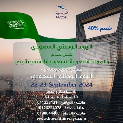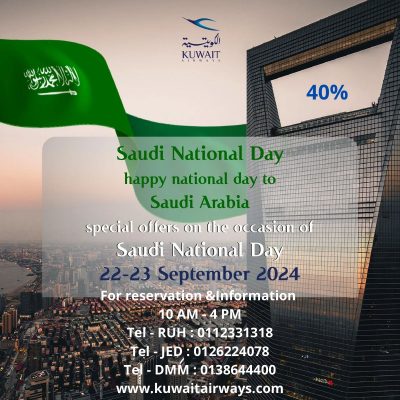 تزامنا مع احتفالات اليوم الوطني السعودي 94 اطلقت الخطوط الجوية الكويتية سلسلة من العروض المميزة والتي تشمل تخفيضات كبيرة على تذاكر السفر درجة السياحية 40% ودرجة الأعمال 30% من المملكة الي العالم ويعد هذا الوقت المثالي للعملاء لاستغلال هذه الخصومات والتمتع برحلات مميزة باسعار تنافسية