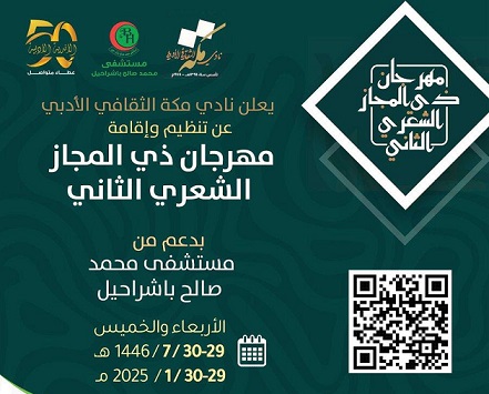 أعلن نادي مكة الثقافي الأدبي عن تنظيم وإقامة “مهرجان ذي المجاز الشعري الثاني” ، بدعم من مستشفى محمد صالح باشراحيل ، وذلك يوم 29 – 7 – 1446 ويستمر لمدة يومين ، وحول المهرجان تحدث رئيس مجلس إدارة نادي مكة الثقافي الأدبي المشرف العام على المهرجان أ.د. حامد بن صالح الربيعي بقوله : بعد النجاح الذي حققه “مهرجان ذي المجاز الشعري الأول” نشرف بتنظيمه في دورته الثانية ، وأكد أن المشاركة في المهرجان سوف تقتصر على شعراء وشاعرات منطقة مكة المكرمة ،