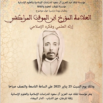 تنظم مؤسسة الملك عبدالعزيز آل سعود للدراسات الإسلامية والعلوم الإنسانية ، ومؤسسة الموقت للعلوم والثقافة، يوما دراسيا حول موضوع ” العلامة المؤرخ ابن الموقت المراكشي : إرثه العلمي وفكره الإصلاحي “، تشارك فيها نخبة من الباحثين والأساتذة الجامعيين المغاربة ، وذلك يوم السبت 25 يناير 2025 ، بداية من الساعة التاسعة والنصف صباحا،بمقر مؤسسة الملك عبدالعزيز آل سعود للدراسات الإسلامية والعلوم الإنسانية ، عين الدياب بالدارالبيضاء .وتفتتح هذه الندوة الفكرية، بكلمة المدير العام المساعد لمؤسسة الملك عبدالعزيز آل سعود للدراسات الإسلامية والعلوم الإنسانية ، وكلمة الرئيس المؤسس لمؤسسة الموقت للعلوم والثقافة، تعقبهما جلستان علميتان ، وفق البرنامج التفصيلي التالي :