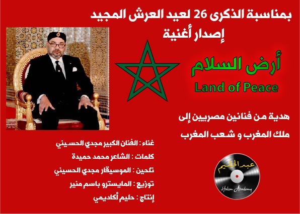 بمناسبة الذكرى 26 لعيد العرش المجيد للمملكة المغربية، تقدم أكاديمية حليم أغنية جديدة مهداة من الموسيقار الكبير مجدي الحسيني والشاعر المصري محمد حميدة .