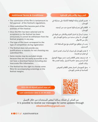 للاطلاع على شروط المشاركة، تفاصيل المسابقات، والمستجدات الخاصة بالمهرجان، يُرجى متابعة الحسابات الرسمية للمهرجان على منصات التواصل الاجتماعي.