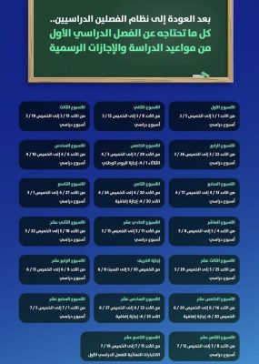 إجازة الخريف: من الخميس 30 أكتوبر حتى السبت 8 نوفمبر 2025 (8 – 17 جمادى الأولى 1447هـ).