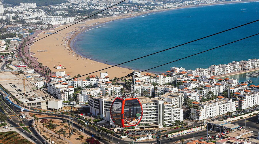 تلفريك اغادير هو اول تلفريك في المغرب يوفر الممر بين محطتي التلفريك، بمقصوراته المنفصلة، إطلالة بانورامية على خليج . على مدى رحلة، مدتها ست دقائق وبطول إجمالي 1700 متر، يوفر التلفريك مناظر خلابة، لا سيما على المحيط الأطلسي و كورنيش المدينة أݣادير بالإضافة إلى منطقة الميناء وأحيائها القديمة. ليلا، وبفضل مصابيح «LED»، تضيء المقصورات السماء.