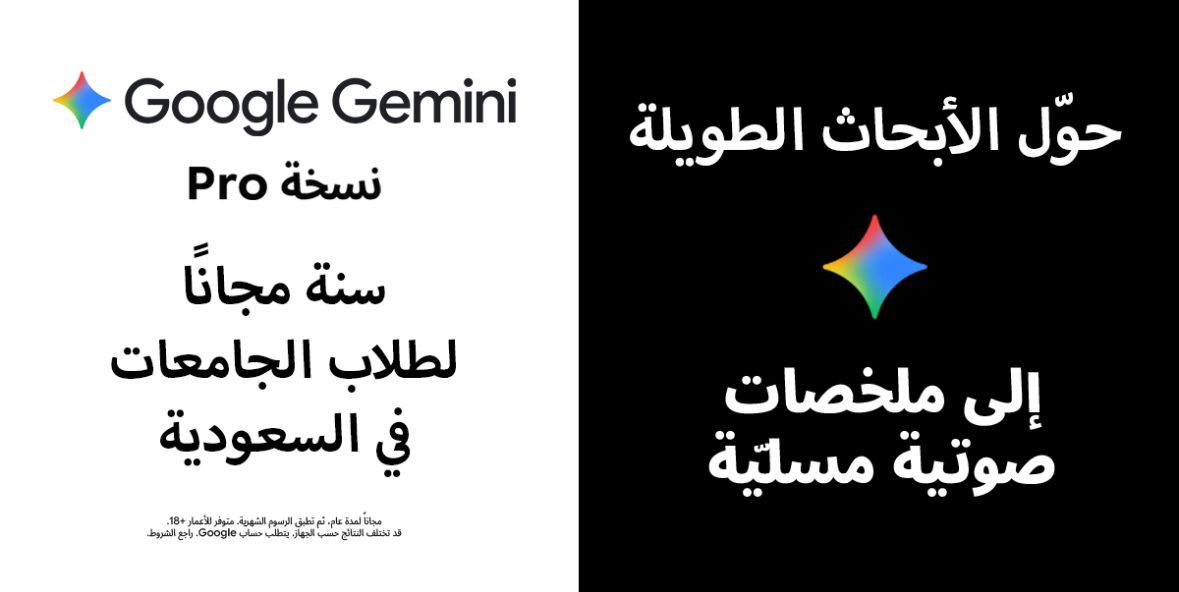 تتعاون شركة Google مع المركز الدولي لأبحاث وأخلاقيات الذكاء الاصطناعي (ICAIRE) الذي تشرف عليه منظمة اليونسكو بمدينة الرياض، للتأكد من استفادة جميع طلاب الجامعات في السعودية من ميزات Gemini من نسخة Pro. يمكن لجميع الطلاب في الجامعات في السعودية – فوق سنّ 18 عام – الاستفادة من العرض حتى 3 نوفمبر من هذا العام والحصول على الاشتراك المجاني لمدة عام كامل ابتداءً من تاريخ التسجيل. تعادل قيمة الاشتراك السنوي المجاني حوالي 680 ريال سعودي للاشتراك الواحد. يمكن للطلاب متابعة الخطوات المدوّنة في صفحة العرض في الرابط.