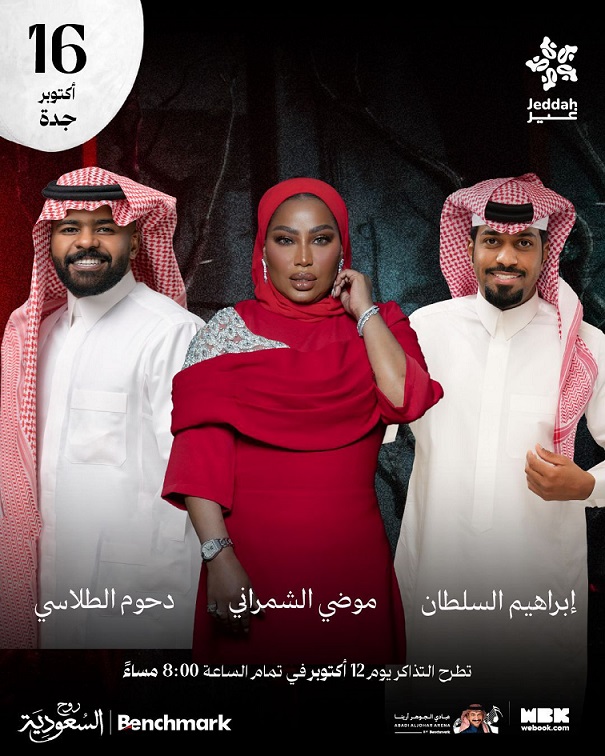 تستعد مدينة جدة لاستقبال أمسية فنية مميزة يوم 16 أكتوبر، تجمع ثلاثة من نجوم الغناء السعودي: موضي الشمراني، إبراهيم السلطان، ودحوم الطلاسي، في ليلة تحمل الطابع الشعبي والطربي الأصيل، بتنظيم شركة بنش مارك ضمن فعاليات موسم جدة.