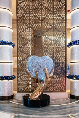 تمّت صناعة المنحوتة من البرونز المصقول، مع قلب شبكي داخلي من الفولاذ المقاوم للصدأ، وتجسّد تحفة “ماي هارت إز يورز” (قلبي ملكك) الرابط العميق بين روحين، حيث يضع كل منهما كيانه بالكامل بين يدي الآخر. يُظهر العمل ببراعة يدان منحوتتان وهما تقدمان قلباً مضاءً من الداخل، يتغير بألوان مُتعدّدة ليعكس انسيابية وتنوّع المشاعر الإنسانية. تتيح هذه التحفة المذهلة لزوّار الفندق فرصة للتوقف والتأمل، حيث تجذبهم بشكلها البصري المميز، وما تحمله من إيحاء دافئ ورمزية قوية للاتحاد والإنسانية المشتركة.