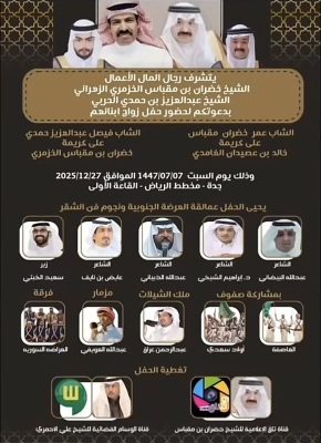 يتشرف رجل الأعمال الشيخ خضران بن مقباس الزهراني بدعوتكم لحضور حفل زواج ابنه الشاب عمر على كريمة الشيخ خالد بن عصيدان الغامدي مساء يوم السبت 7 / 7 / 1447هـ، وذلك بقاعة الأولى للاحتفالات والمؤتمرات بحي مخطط الرياض بجدة يحيي الزواج عدد من كبار شعراء العرضة الجنوبية وعدد من الإعلاميين البارزين وبحضوركم تكتمل الأفراح والمسرات .